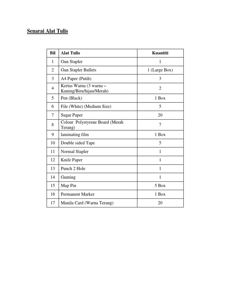 Jadual Senarai Alat Tulis Untuk Keperluan Pejabat Di Yayasan Pewira Pdf